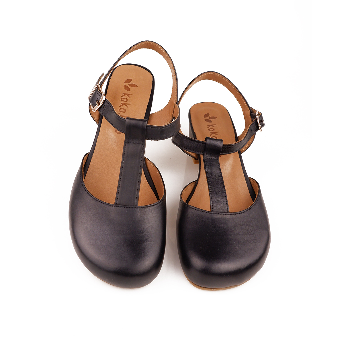 Modello chiuso in punta, a chanel con cinturino a "T" e tallone scoperto.