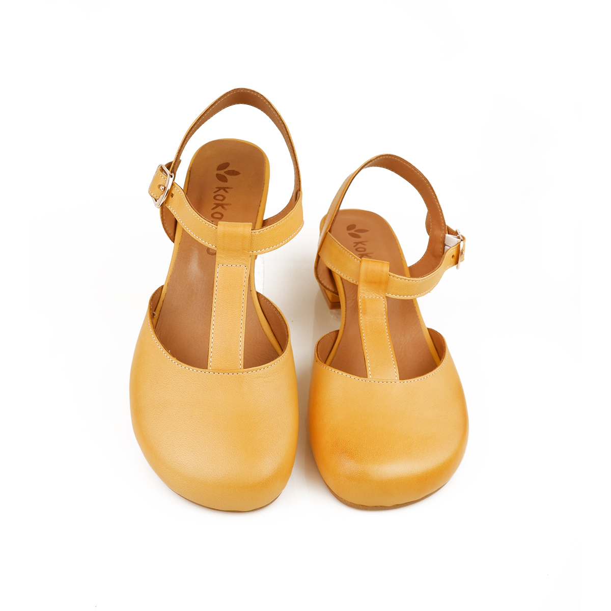 Modello chiuso in punta, a chanel con cinturino a "T" e tallone scoperto.