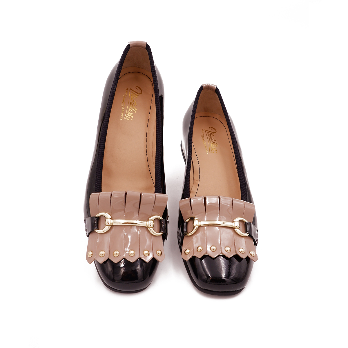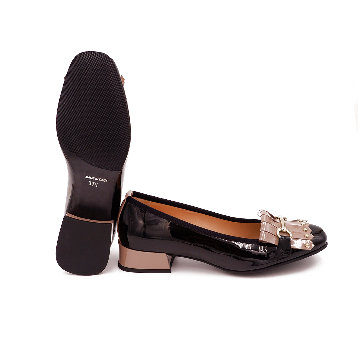 Decoltè con la frangia in pelle verniciata con morsetto.