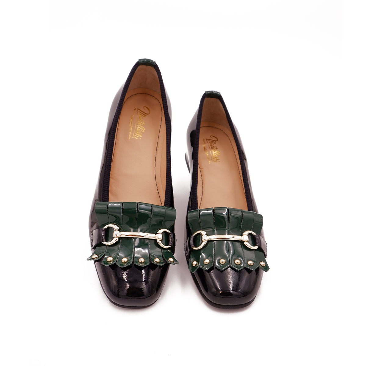 Decoltè con la frangia in pelle verniciata con morsetto.