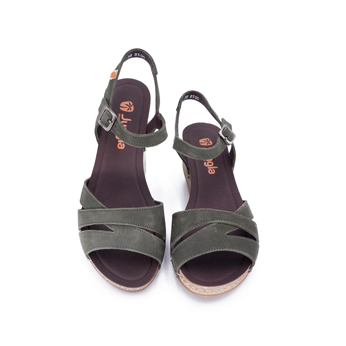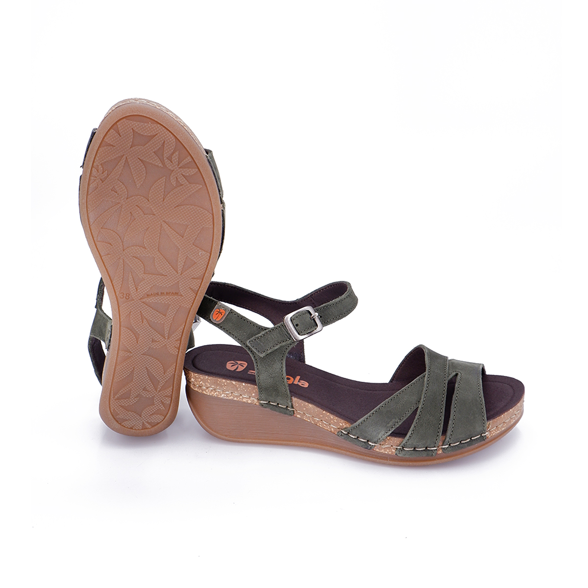 Sandalo con cinturino incrociato, fondo in gomma e tomaia in pelle conciata al vegetale a taglio vivo.